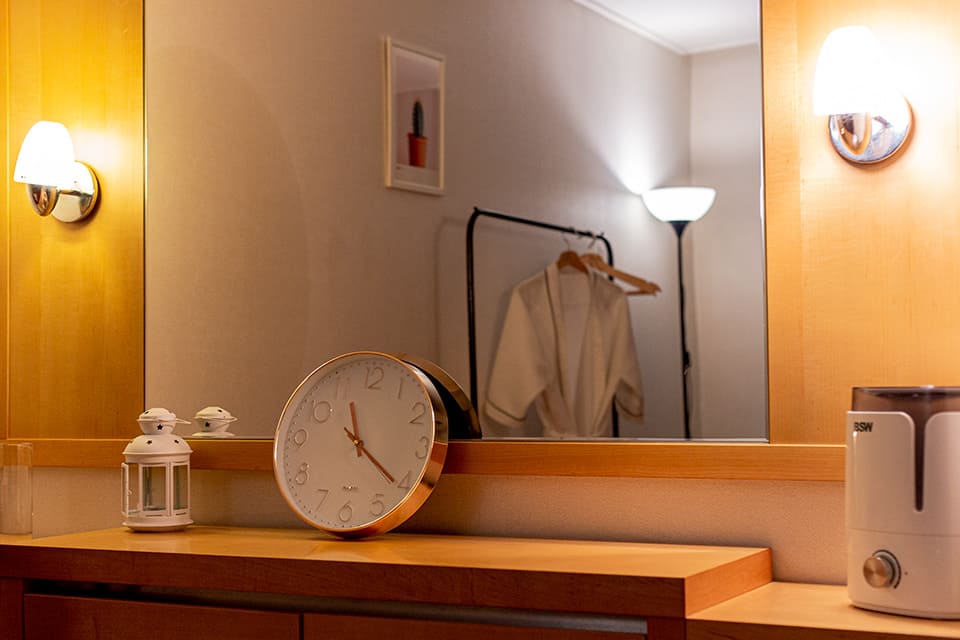 관리실에 있는 화장대에는 캔들과 가습기 그리고 시간을 체크할 수 있는 시계까지 있습니다. 내가 어떤 코스를 선택했는지에 따라 관리시간이 달라지는데 이렇게 시계가 있으면 따로 체크하지 않아도 되니 편하긴 할 것 같네요!