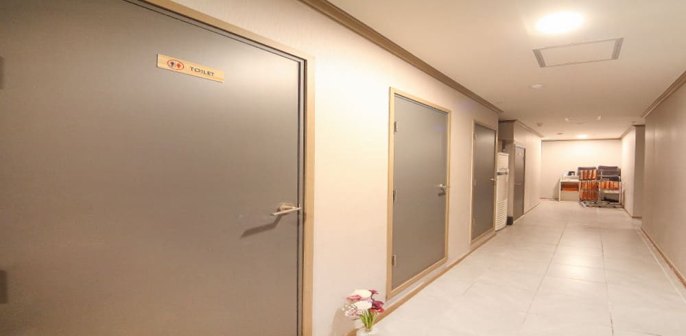 충무공동 스웨디시 플라워는 실내에 화장실이 마련되어 있어요. 그래서 굳이 밖으로 나가야하는 일이 없기 때문에 그만큼 번거로움이 줄어들고 편하게 이용할 수 있다는 장점이 있답니다. 문 옆으로 이쁜 꽃들이 담겨있는 화병도 보이는데요, 상징성을 잘 나타내고 있는 것 같아요.