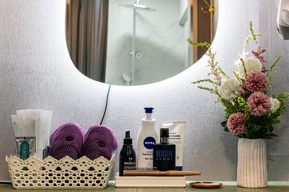이렇게 화장대도 깔끔하게 준비가 되어 있는데요, 1회용 칫솔이 있어 위생적으로 양치도 가능합니다. 그리고 수건도 넉넉하게 준비가 되어 있으며, 샤워 후 헤어 용품이나 기본적인 스킨 로션은 업체 측에서 제공을 다 하고 있으니까 걱정하지 마시고 그냥 맨몸으로 찾아와주시면 된답니다!